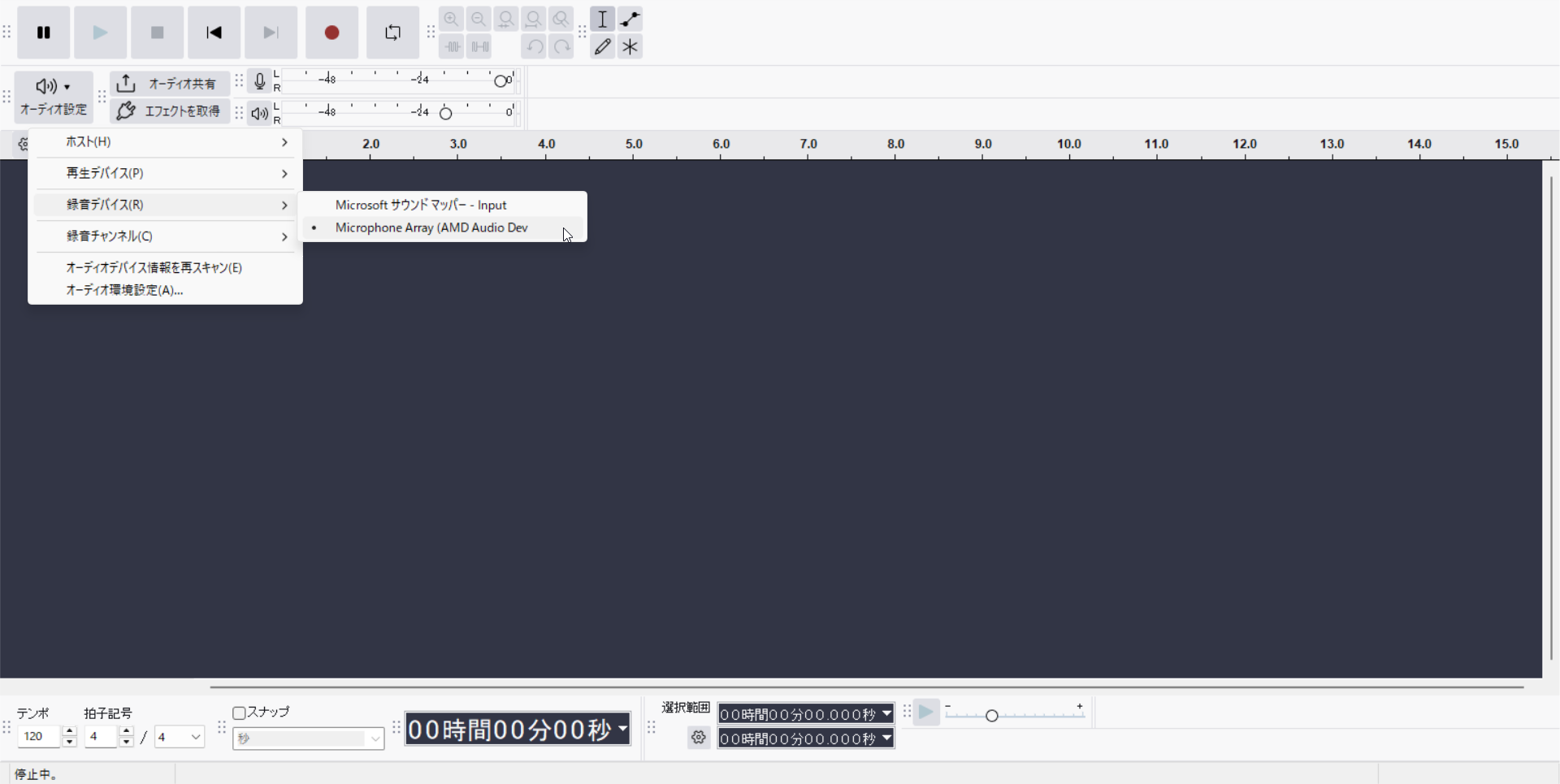 Audacityを起動したら、まず画面上部のツールバーでマイクの設定を確認します。ここを間違えると音が録れないので、最初に必ず見ておきましょう。