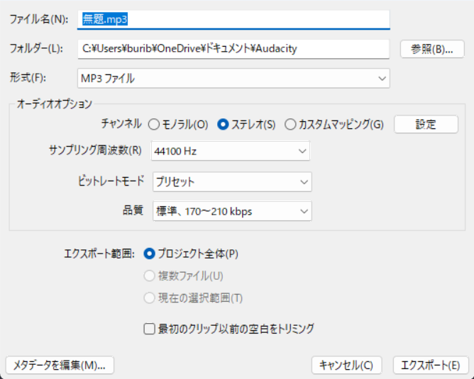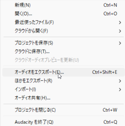 「MP3として書き出し」が見つからない場合は、形式でMP3を選択してください。Audacityのバージョンによって表示が異なります。